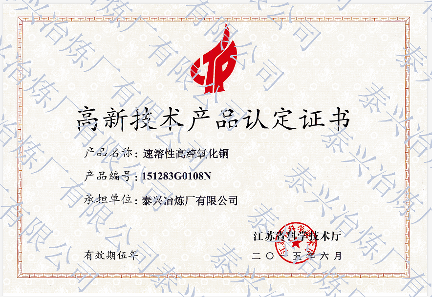 自主研發(fā)的空氣二次氣提生產(chǎn)高純堿式碳酸銅,填補國內(nèi)空白,獲得泰州市科技進步二等獎